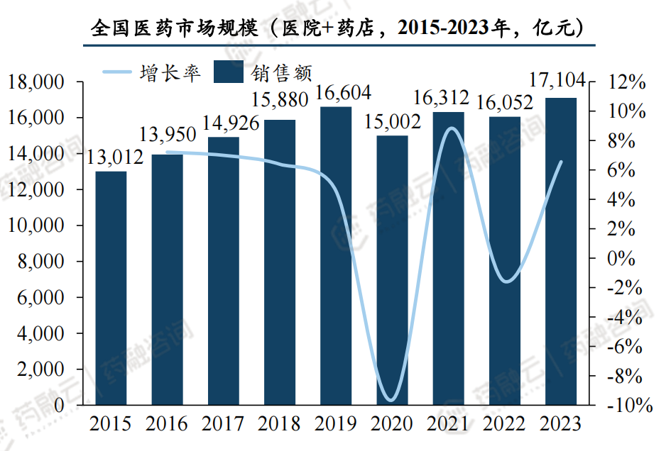 近年来,中药市场保持了稳定增长态势,市场规模持续扩大。据药融云数据统计,2015-2023年全国医院+药店市场规模呈波动增长态势,年复合增长率为3.09%;2023年,全国医药市场规模总计超1.7万亿元,其中,医院终端市场规模约1.39万亿元,药店终端市场规模约3172亿元。