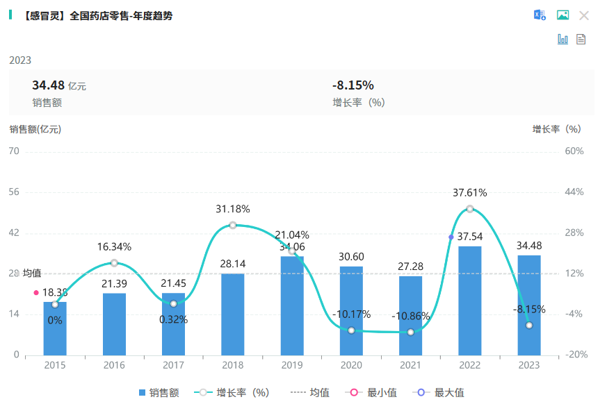 其次为强力枇杷露,有121条批文。而感冒灵胶囊、感冒灵颗粒、小儿肺热咳喘颗粒分别有24个、30个、4个批文。据药融云数据库显示,感冒灵在2023年全国药店零售市场的销售总额达34.48亿元。