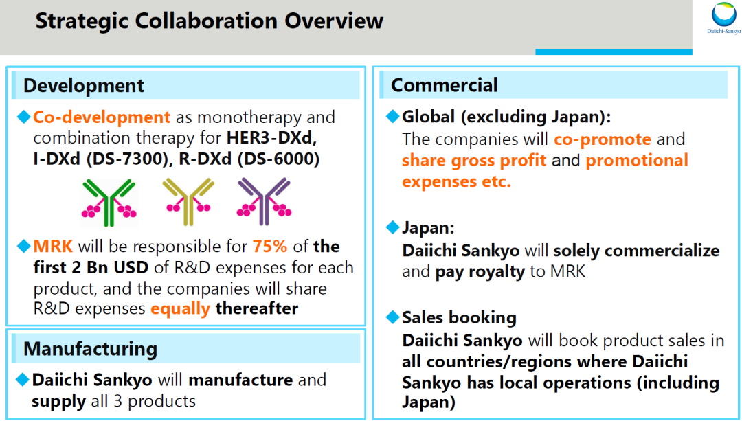 这项合作开始于2023年10月,第一三共和默沙东就第一三共的三款ADC候选药物:patritumab deruxtecan(HER3-DXd)、ifinatamab deruxtecan(I-DXd)和raludotatug deruxtecan(R-DXd)达成了全球开发和商业化协议,将在全球范围内共同开发和潜在商业化这些候选ADC疗法。第一三共将保留日本的独家权利。第一三共将全权负责产品生产和供应。