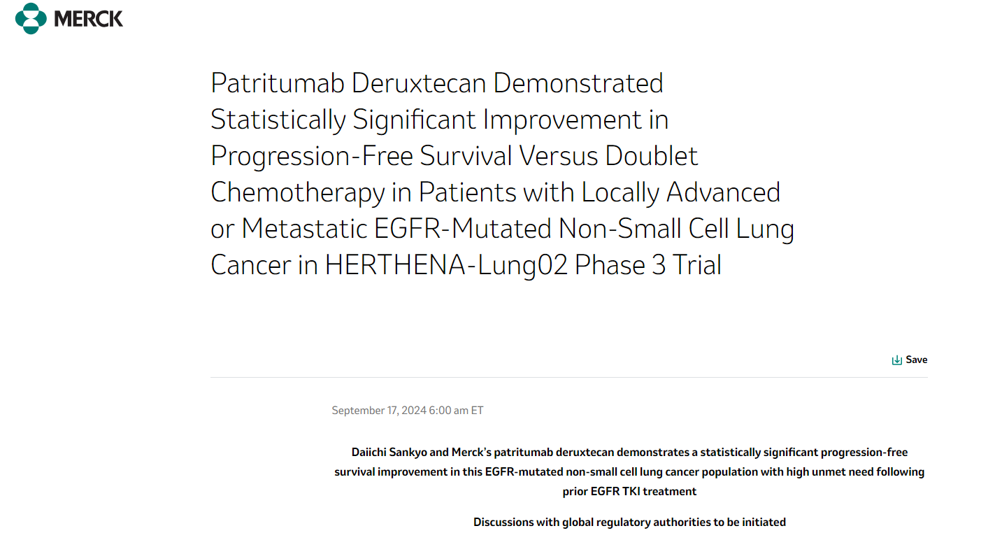 9月17日,Merck和第一三共宣布其ADC药物patritumab deruxtecan(HER3-DXd)已通过了3期HERTHENA-Lung 02研究。在今年的ESMO会议结束几个月后,该药物因生产问题被美国FDA拒之门外。根据公布的结果,两家公司将与全球监管单位就该试验结果进行进一步的讨论。