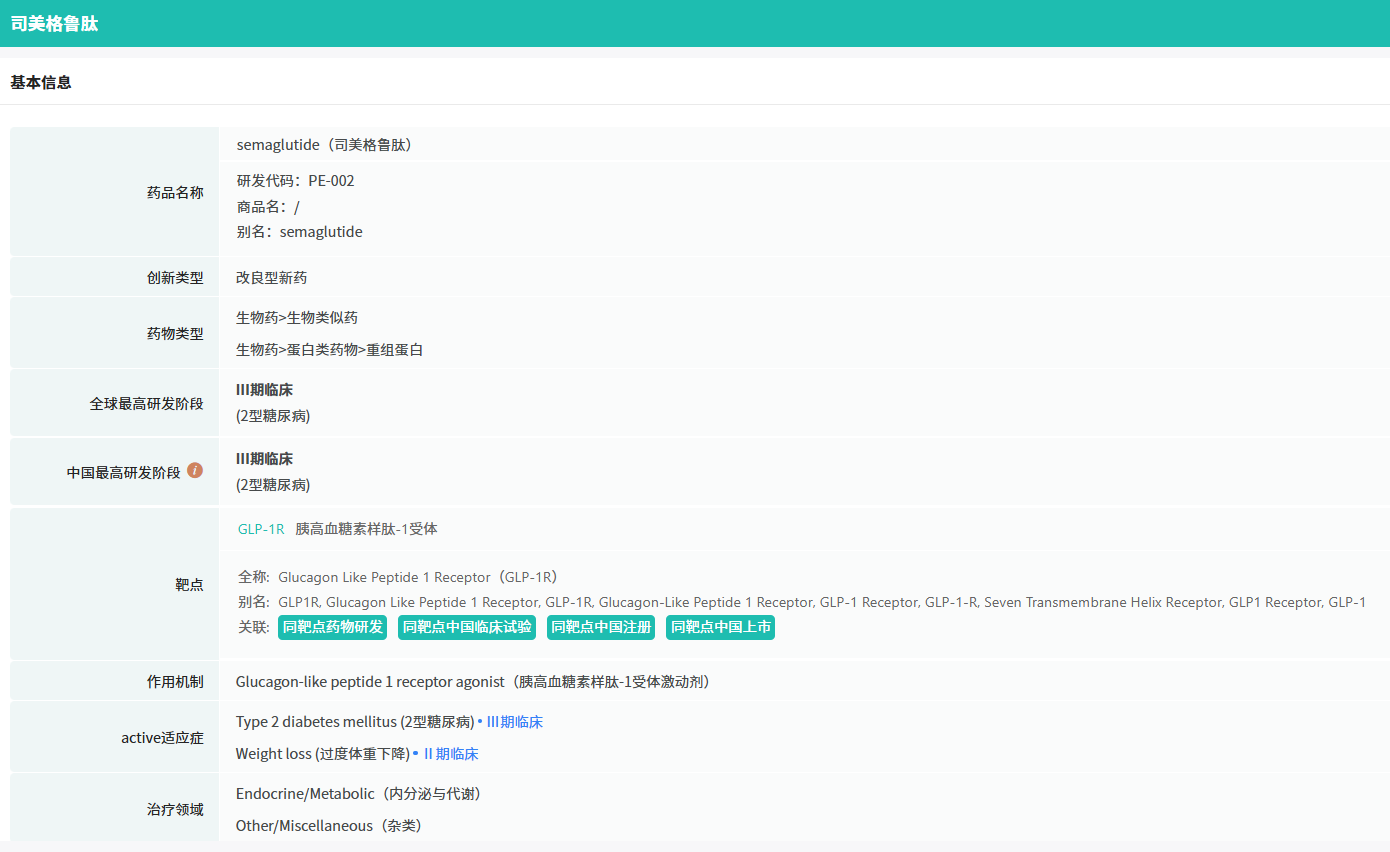 司美格鲁肽是一种长效人胰高糖素样肽-1(GLP-1)类似物,与天然GLP-1的氨基酸序列具有94%的同源性,能起到GLP-1受体激动剂的作用。司美格鲁肽原研药由诺和诺德(Novo Nordisk)开发,已在全球多个国家和地区获批,适应症覆盖2型糖尿病以、减重、以及降低患有心血管疾病和肥胖或超重的成人心血管死亡/心脏病发作和中风的风险等。