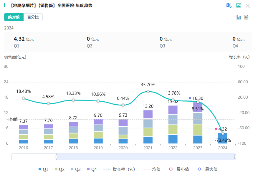地屈孕酮片由雅培开发,地屈孕酮片为国家医保乙类品种。目前已在100多个国家获批上市,用于治疗由内源性孕酮不足引起的相关疾病,如痛经、子宫内膜异位症、孕激素缺乏所致先兆性流产或习惯性流产及辅助生殖技术中的黄体支持等。据药融云数据库显示,地屈孕酮片在2023年全国院内市场的销售额超16亿元,同比增长达8.51%。