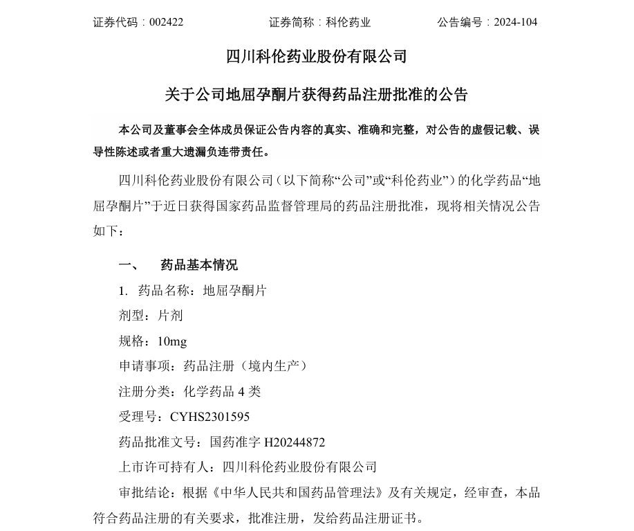 9月18日,四川科伦药业发布公告,该公司提交的4类仿制药地屈孕酮片获批并视同通过一致性评价,是国内第3家获批的地屈孕酮片仿制药企业。据药融云数据库显示,地屈孕酮片在2023年全国院内市场的销售额超16亿元。