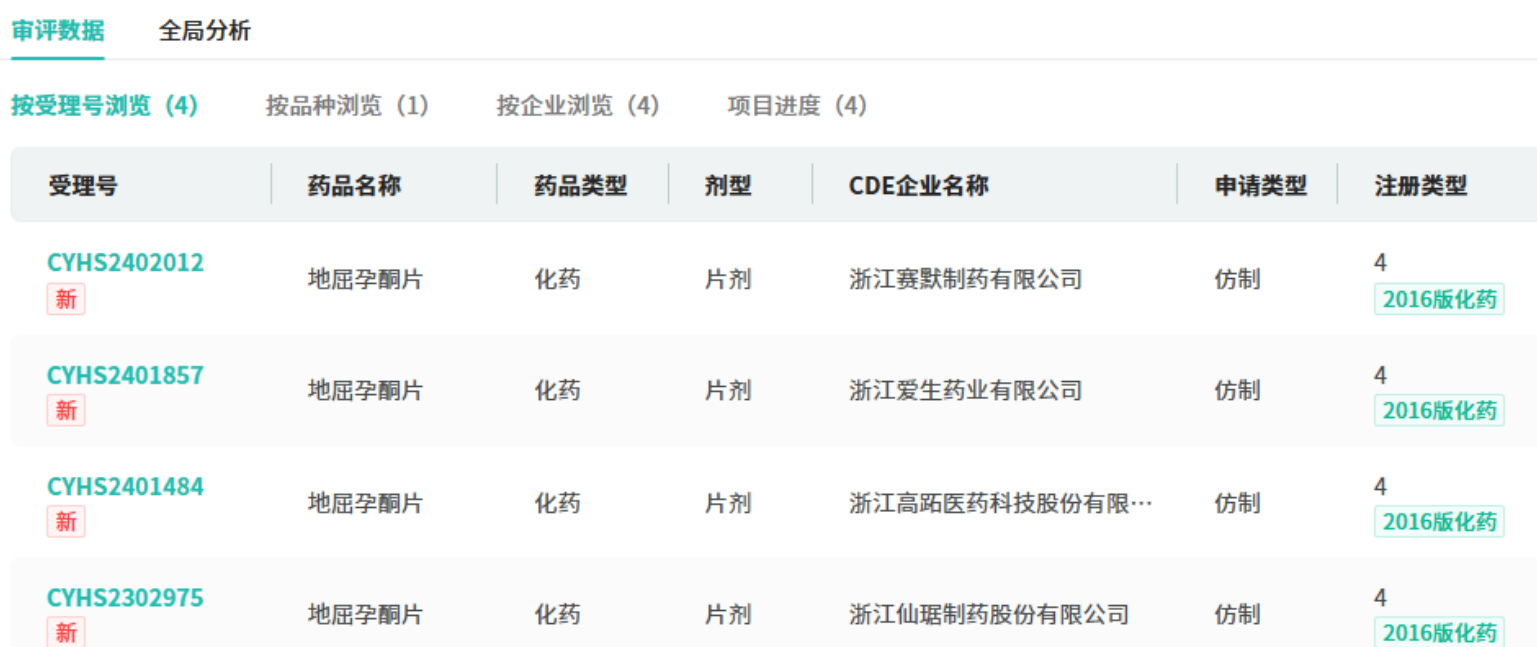 在仿制药布局方面,地屈孕酮片有浙江高跖医药、浙江爱生药业、浙江仙琚制药、浙江赛默制药4家药企提交了4类仿制申请。