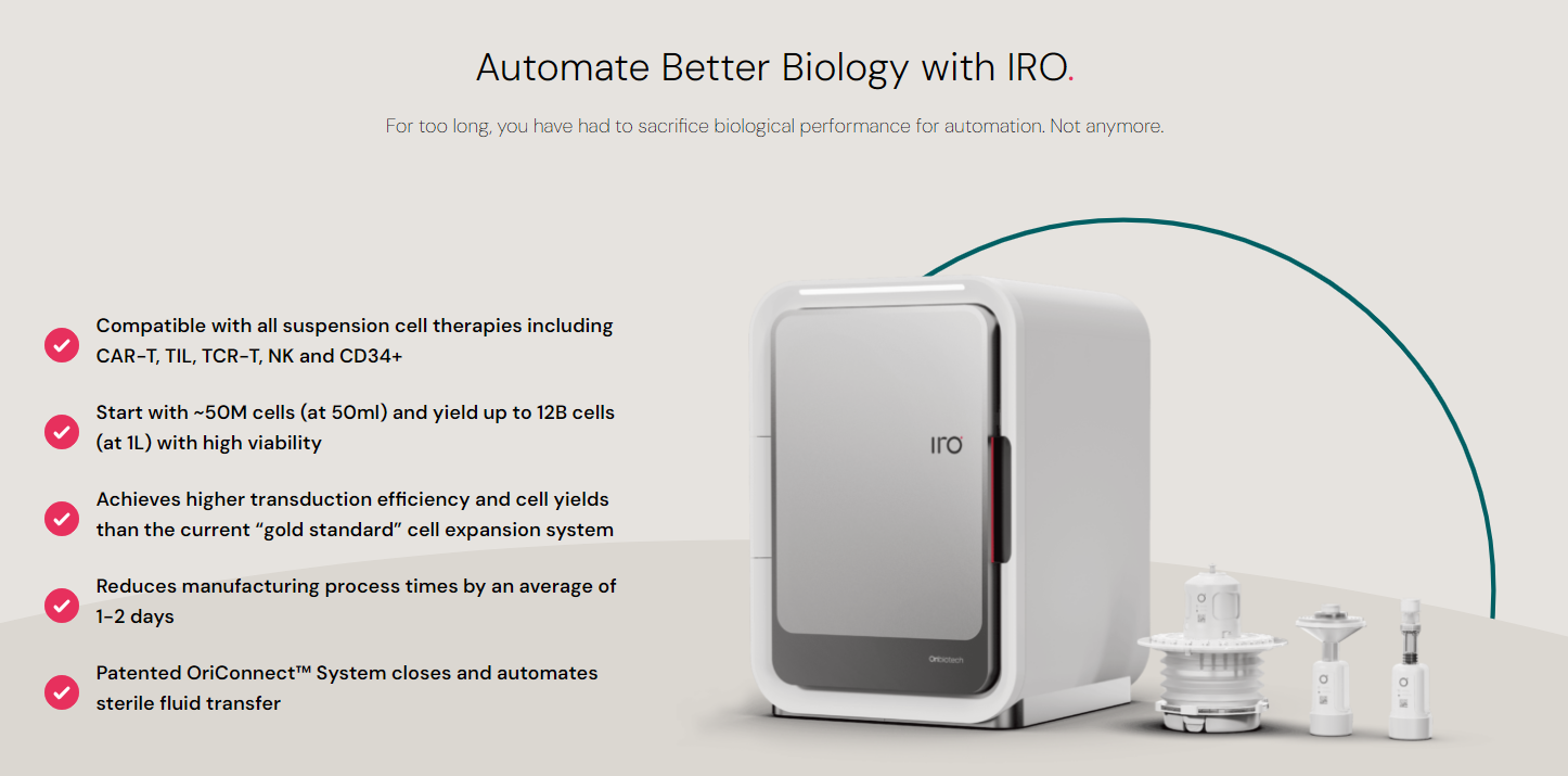 Ori 和 Charles River 将继续合作,确保下一代细胞产品能够使用IRO平台进行临床开发,并扩大其临床和商业影响。IRO可以大大缩短疗法开发时间,更快地为患者提供挽救生命的产品,减少多达70%的劳动力,降低多达50%的商品成本,减少约 25% 的加工时间,并将技术转让时间从数月缩短到数周。