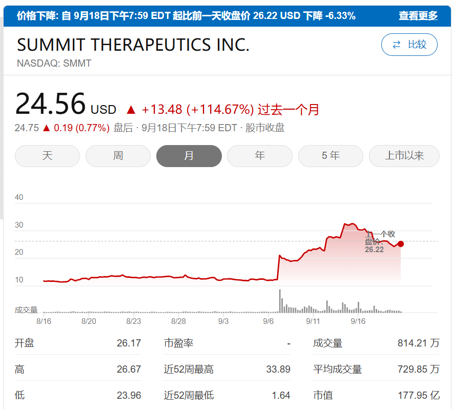 海外合作方Summit Therapeutics Inc.(SMMT 纳斯达克)4个月内股价上涨12倍,市值达231亿美元(约1800亿港元)。
