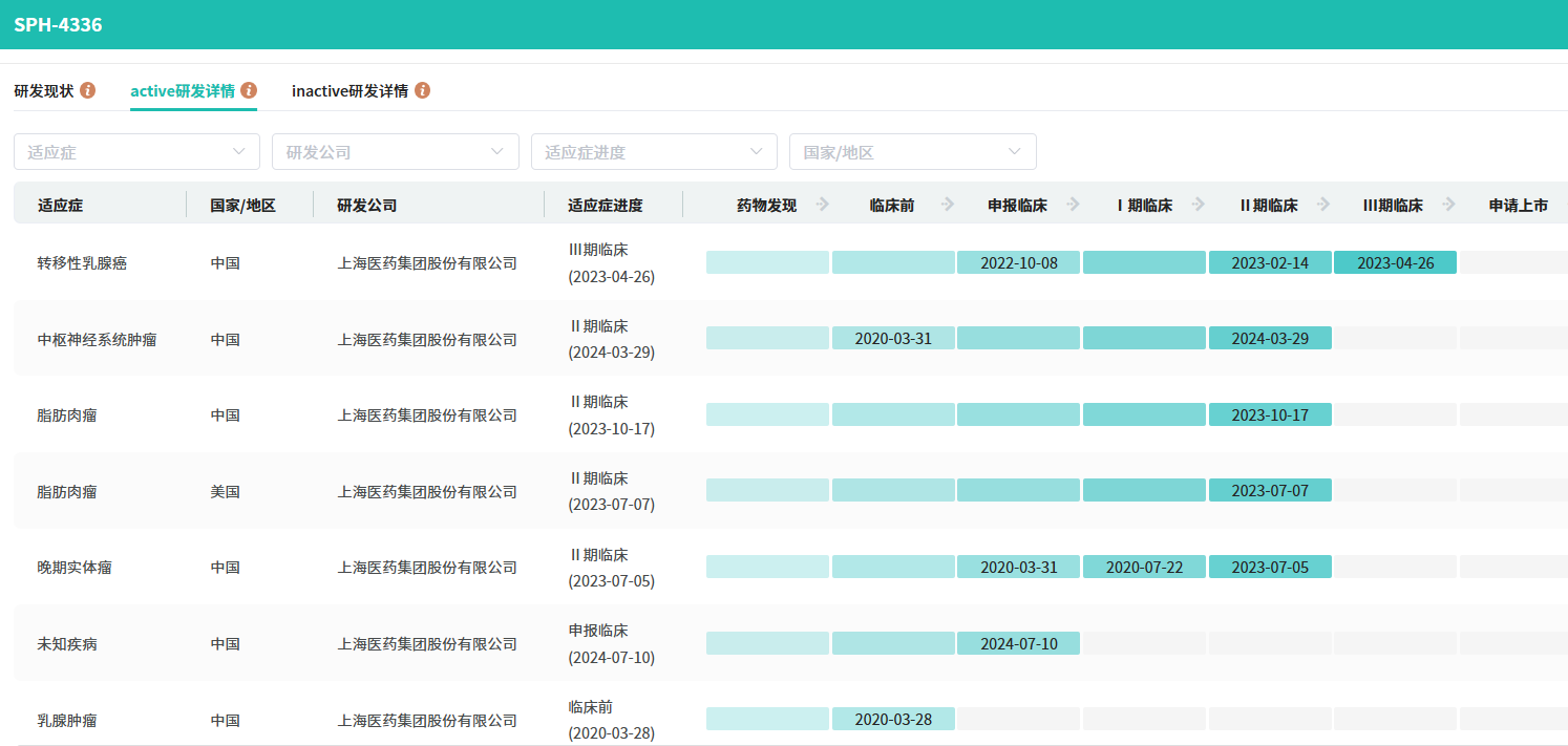 SPH4336片已经在中国开展了多项临床研究,其中联合来曲唑一线治疗乳腺癌、联合内分泌疗法治疗乳腺癌已经进入2/3期临床研究阶段,该产品单药或联合康方生物PD-1/CTLA-4双特异性抗体卡度尼利治疗晚期实体瘤、联合内分泌治疗伴脑转移乳腺癌则处于2期临床研究阶段。