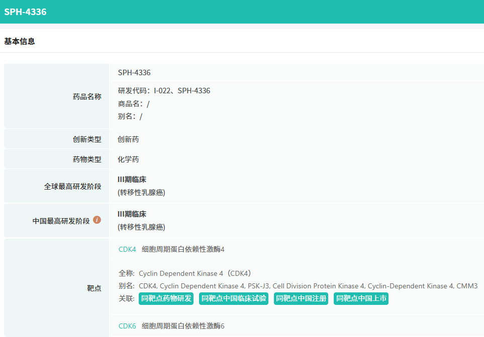 SPH4336是一种新型高选择性口服抑制剂,具有广谱的抗肿瘤作用。该产品对CDK4/6靶点具有较高的选择性,同时具有广谱抗Rb阳性肿瘤活性。本次获批临床的适应症为SPH4336片联合第三代EGFR-TKI奥希替尼治疗KRAS突变型晚期实体瘤。