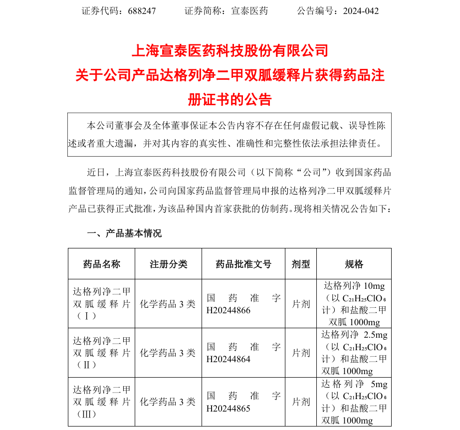 9月19日,上海宣泰医药发布公告,其公司提交的3类仿制药达格列净二甲双胍缓释片获批上市,达格列净二甲双胍缓释片为国内首家获批的仿制药,用于治疗2型糖尿病。