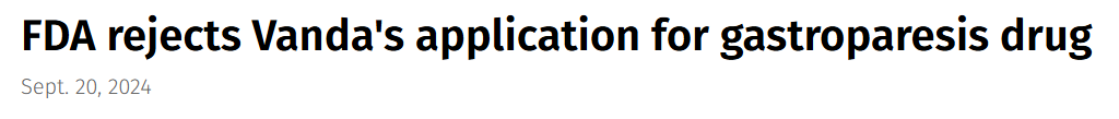 近日,Vanda Pharmaceuticals公司宣布,FDA拒绝批准其用于治疗胃轻瘫的药物tradipitant的新药上市申请(NDA),并提供了完全回复函(CRL)。