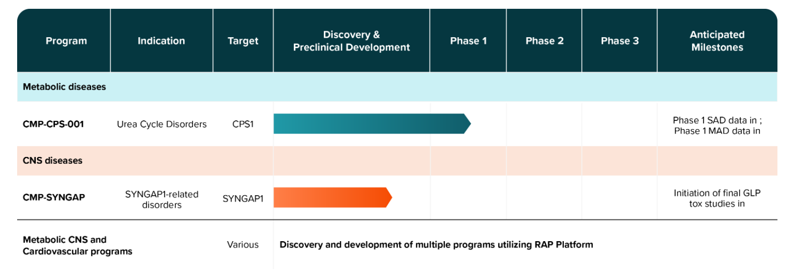 其主要ASO候选药物CMP-CPS-001旨在针对尿素循环紊乱 (UCD) ,正在进行一期试验,有可能成为治疗UCD的首个疾病改良疗法,2024年9月12日,美国FDA已授予CMP-CPS-001孤儿药资格认定,用于治疗UCD。公司预计将在2025年第一季度报告单次递增剂量 (SAD) 部分试验的所有四个队列的数据,并在2025年下半年报告多次递增剂量 (MAD) 部分试验的数据。