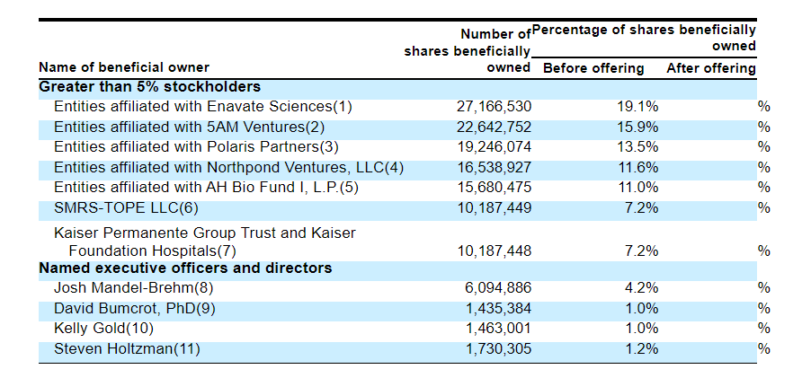 Enavate Sciences是该公司最大的股东,持有19.1%的股份。Enavate也是Upstream Bio的最大股东之一,这家公司在本周早些时候公布了IPO计划。5AM Ventures、Polaris Partners、Northpond Ventures、a16z Bio + Health、HarbourVest Partners 和 Kaiser Permanente 均持有 CAMP4 5% 以上的股份。