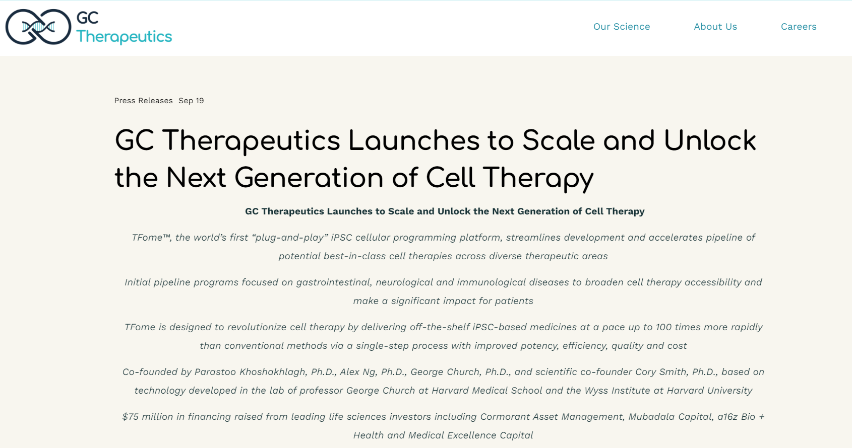 GCTx公司的诱导多能干细胞(iPSC)编程平台TFome™由哈佛大学医学院和Wyss研究所的George Church博士实验室的世界级科学家团队发明和开发,整合了合成生物学、基因编辑、细胞工程和机器学习领域的最新进展,克服了细胞疗法在开发和规模化方面的复杂性,提高了患者在广泛疾病领域的可及性。