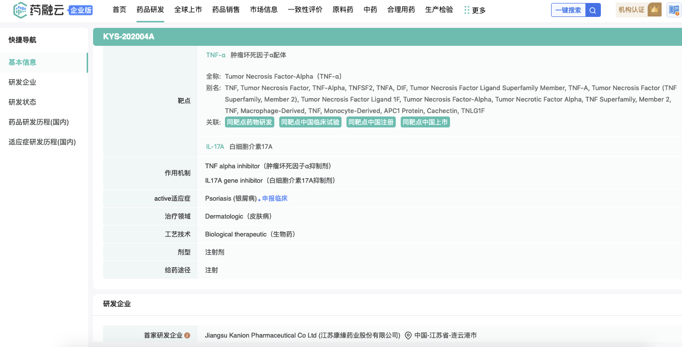 KYS202004A 注射液是公司自主研发的一种双靶点Fc融合蛋白,其拟用适应症为银屑病(一种遗传与环境共同作用诱发的免疫介导的慢性、复发性、炎症性、系统性疾病。临床表现为鳞屑性红斑或斑块,局限或广泛分布)。KYS202004A 可以通过同时阻断 TNF-α 与 IL-17A 的信号通路,抑制TNF-α 与IL-17A介导的下游细胞因子、趋化因子的产生,从而有效控制炎症反应,减轻皮肤病变,缓解银屑病临床症状。临床前药理学研究表明,KYS202004A 可以显著缓解食蟹猴银屑病模型的皮肤红斑、皮屑、增厚等临床症状,在同等剂量下,KYS202004A 的改善作用优于单靶点已上市药物;毒理学研究显示,食蟹猴单次及多次给予 KYS202004A 未发现药物介导的非特异性毒性反应,耐受性良好。KYS202004A 注射液的开发有望为银屑病患者提供疗效更优、更长久的治疗选择。