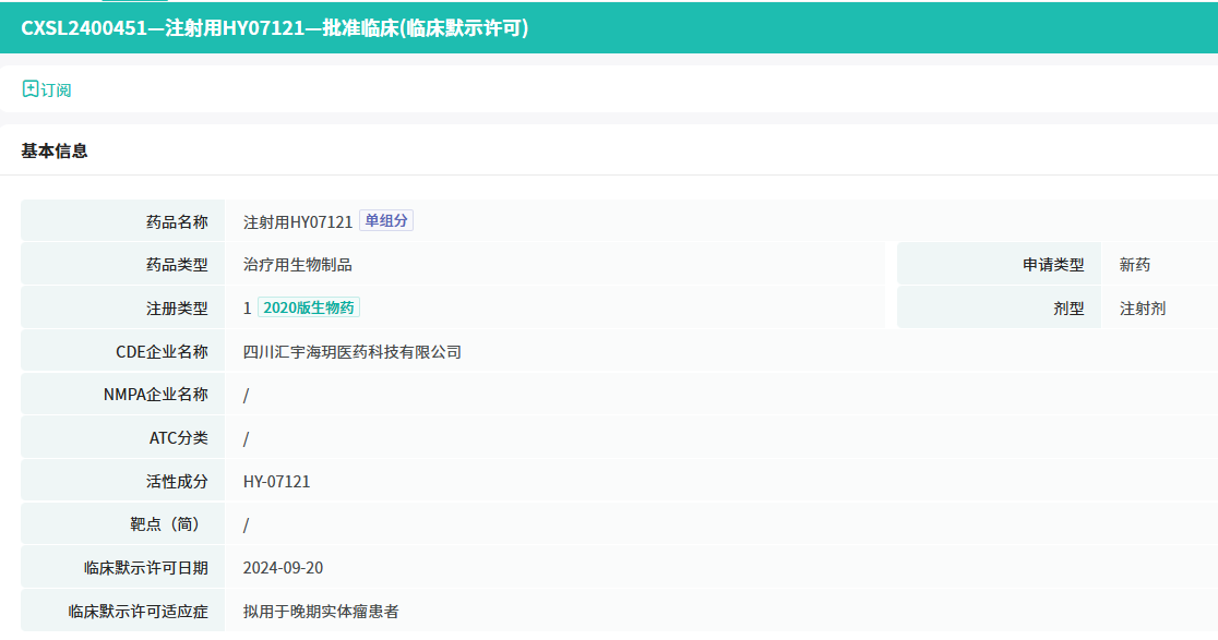 9月21日,汇宇制药发布公告称,该公司的1类新药——靶向PD-1/TIGIT/IL-15 的三靶点抗体融合蛋白注射用HY07121获得临床试验默示许可,拟用于晚期实体瘤患者。