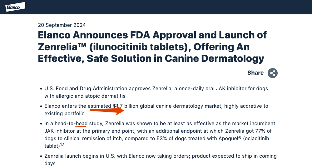 2024年9月20日,动物保健巨头 礼蓝动保/Elanco Animal Health宣布,美国食品和药品监督管理局(FDA) 批准 Zenrelia™(ilunocitinib 片剂)(音译伊鲁昔替尼)上市。本品是一种安全、高效且方便的每日一次口服JAK抑制剂新药,用于控制与过敏性皮炎相关的瘙痒(瘙痒)和控制至少12个月大的犬的特应性皮炎(AD)。