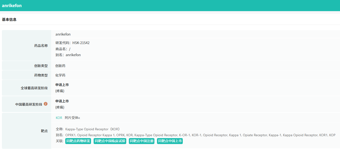 HSK21542是海思科研发的强效外周kappa阿片受体(KOR)选择性激动剂,其具有高选择性和亲和性,在G蛋白参与下协同调控钾离子流和钙离子流,可阻断疼痛和瘙痒信号传导,并通过抑制背根神经节和末梢感觉神经的兴奋性,减少炎性因子以及神经递质的释放,起到镇痛和抑制瘙痒的作用。该产品不透过血脑屏障,在发挥外周镇痛、止痒药效的同时,能避免中枢阿片类药物相关副作用,如致幻、成瘾、呼吸抑制等。该产品的腹部手术术后镇痛的上市申请此前已经获得CDE受理。