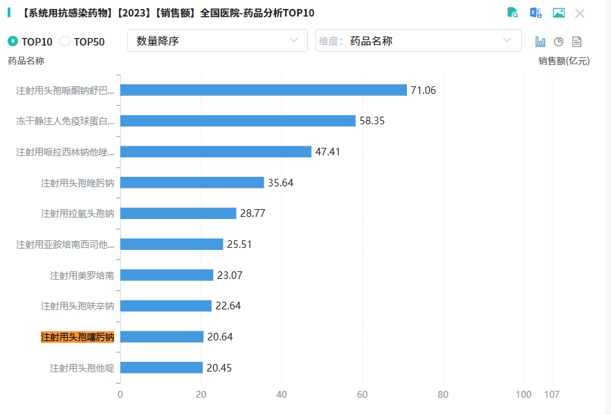 在2023年全国医院系统用抗感染药物(化学药或生物药)销售排行榜中,注射用头孢噻肟钠强势入围,荣列院内系统抗感染药物销量TOP9榜单。