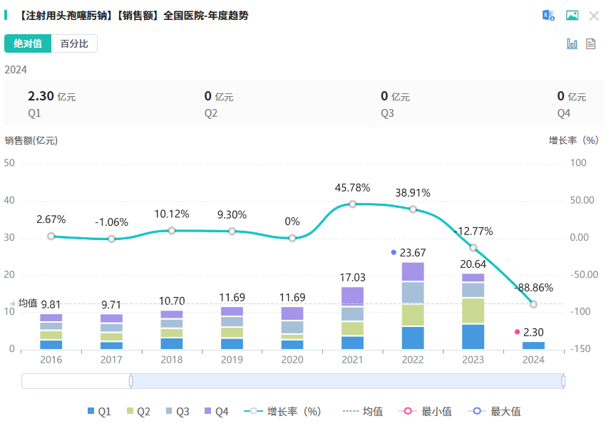 9月24日,据NMPA公示,瑞阳制药提交的注射用头孢噻肟钠通过一致性评价。据药融云数据库显示,注射用头孢噻肟钠在2023年全国院内市场的销售额超20亿元。