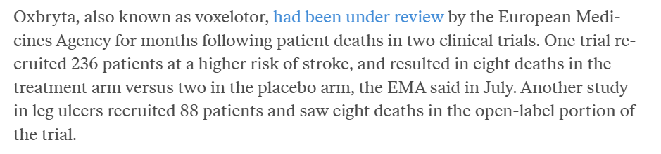 在两项临床试验中有患者死亡后,voxelotor已经接受了欧洲药品管理局数月的审查。