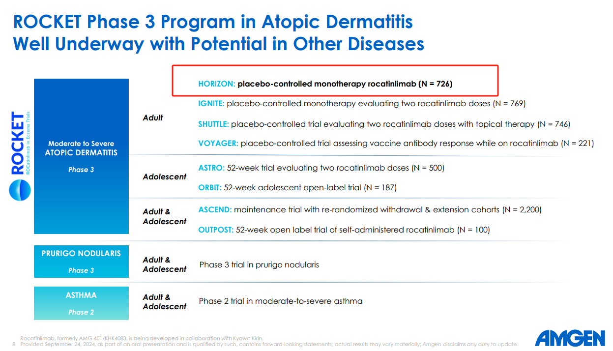 Horizon研究是安进公司正在进行的有关rocatinlimab八项III期试验中的第一项,此外围绕rocatinlimab的研究还覆盖特应性皮炎、哮喘、结节性痒疹等多个适应症。