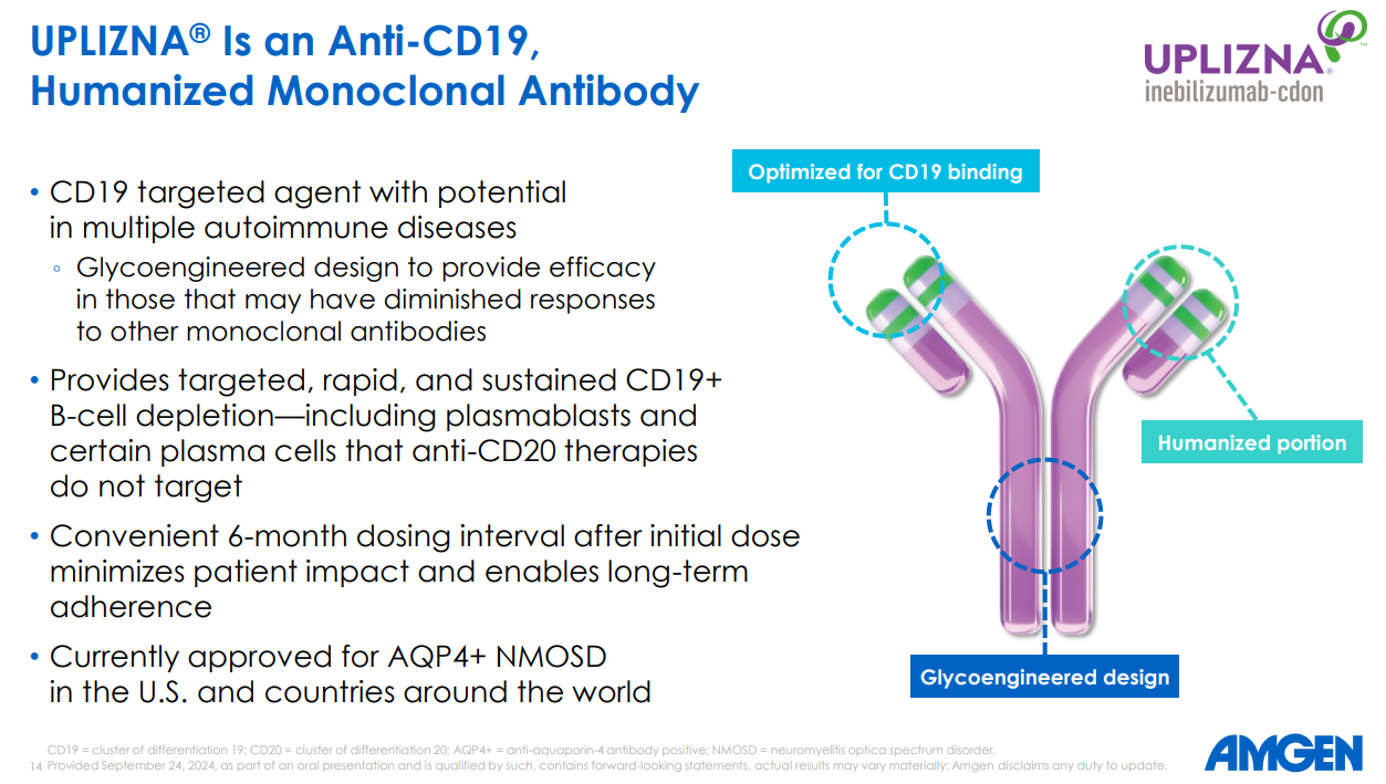 Uplizna是一款对CD19具有高度亲和力的人源化单克隆抗体。CD19表达在多类B细胞上,其中包括分泌抗体的成浆细胞(plasmablasts)和浆细胞。通过与CD19抗原结合,Uplizna能够迅速将这些细胞从血循环中清除,从而降低自身抗体的产生,缓解患者症状。它最初由Viela Bio公司开发,在2020年首次获得FDA的批准,治疗视神经脊髓炎谱系疾病(NMOSD)患者。
