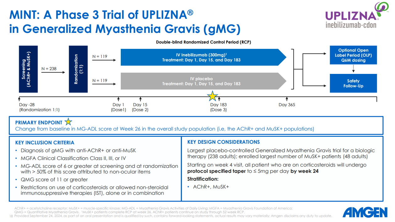 MINT研究中共入组238例全身性重症肌无力患者,按1:1随机分组接受Uplizna单药或安慰剂治疗,主要终点为总体研究人群第26周时重症肌无力日常活动量表(MG-ADL)评分与基线相比的变化。