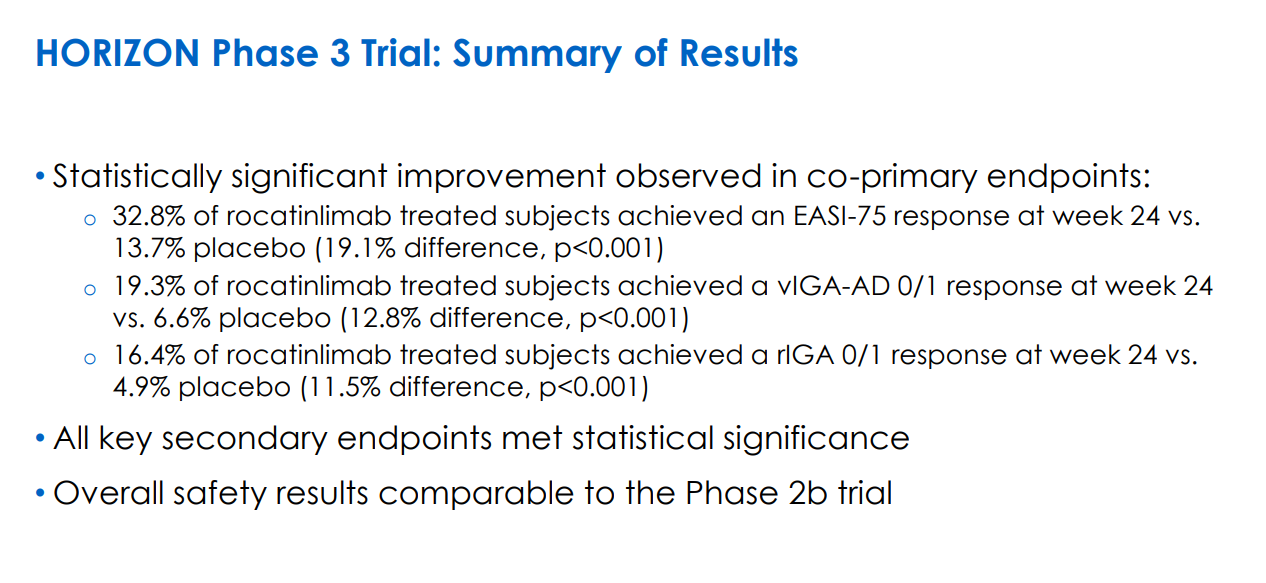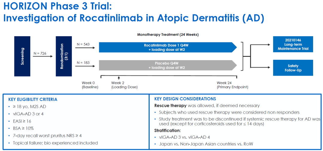 HORIZON研究(NCT05651711)中共入组726例特应性皮炎患者,按3:1随机分组接受Rocatinlimab单药或安慰剂治疗,主要终点为治疗24周的EASI-75和fIGA 0/1,旨在评估Rocatinlimab 单药治疗中度至重度特应性皮炎 (AD) 成年患者的疗效、安全性和耐受性。