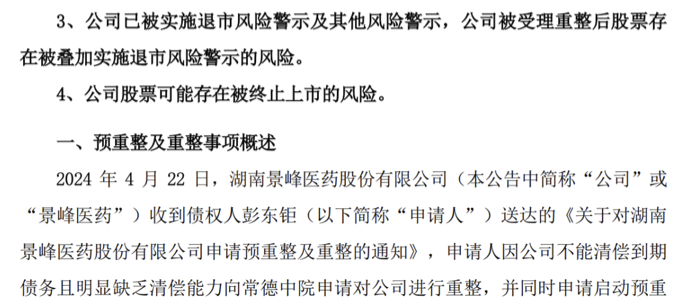*ST景峰最新公告:石药控股集团有限公司(以下简称“石药集团”)虽已缴纳尽调保证金并提交预重整投资方案中选为预重整投资人,但重整事项仍面临多重不确定性,包括但不限于重整方案的最终确定、权益调整安排、重整投资款项支付、股价及重整投资成本、重整投资人内部审议程序、司法审查程序、债权人会议审议结果及股东大会审议结果等。因此,石药集团最终能否参与重整并执行完毕重整计划尚存在重大不确定性。