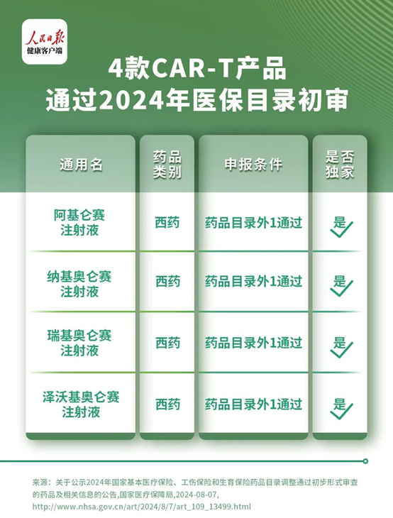 今年,国家医保局对2024年国家医保药品目录进行了初步形式审查,其中包括了多款CAR-T细胞治疗产品。据公示信息显示,共有440个药品通过了初步形式审查,其中包括4款CAR-T产品。