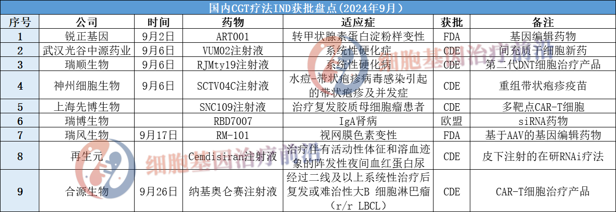 细胞和基因疗法作为医学的新前沿,正表现出巨大的潜力和发展势头,特别是在治疗难治性疾病方面,越来越多细胞和基因疗法临床试验被开启。据工业和信息化部办公厅发布通知,加快布局建设一批制造业高质量发展急需的中试验证平台,细胞及基因治疗行业迎大利好。据不完全统计2024年9月又有9款CGT疗法获批IND,整理如下: