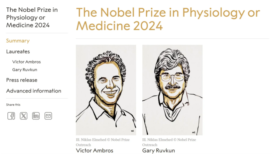 北京时间10月7日下午,2024年诺贝尔生理学或医学奖揭晓,科学家维克托·安布罗斯(Victor Ambros)和加里·鲁夫昆(Gary Ruvkun)获奖,以表彰他们发现了microRNA及其在转录后基因调控中的作用。