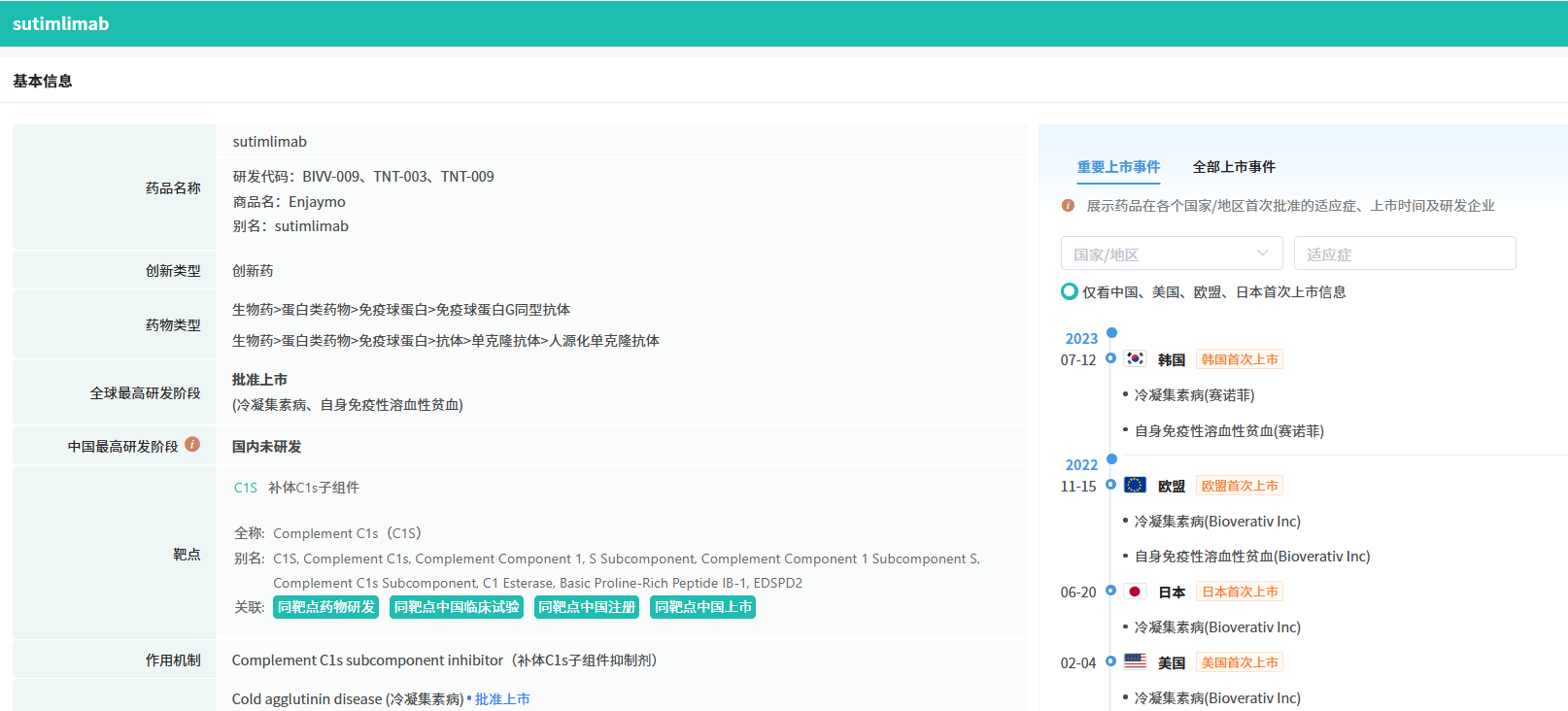 2024年10月4日,Recordati宣布与赛诺菲达成协议获得其C1s单克隆抗体Enjaymo®(sutimlimab)的全球权利。Enjaymo靶向与经典补体系统激活相关的C1复合物中的丝氨酸蛋白酶C1s,从而抑制溶血过程发生,且不抑制凝集素和替代途径。特别的是,Enjaymo是首个且唯一一款获批用于治疗冷凝集素病的治疗方法。