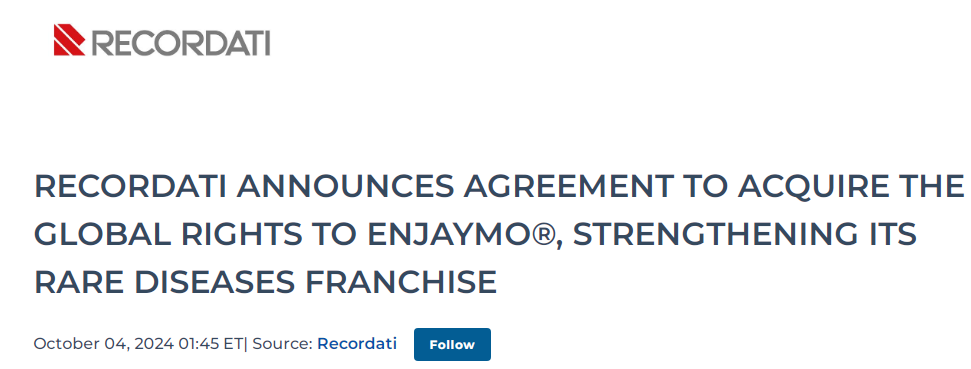 截至2024年8月,Enjaymo®在过去12个月中创造了约1亿欧元(约1.1亿美元)的收入,预计2025 财年的收入将超过1.5亿欧元(约1.65亿美元),最高销售额可达2.5-3亿欧元(2.74-3.29亿美元),是目前水平的两倍多。根据交易完成日期,Recordati 预计2024 年的收入贡献极小。预计该交易将立即增加息税折旧摊销前利润(EBITDA),到 2025 年,利润率将超过目前罕见病公司的平均水平。