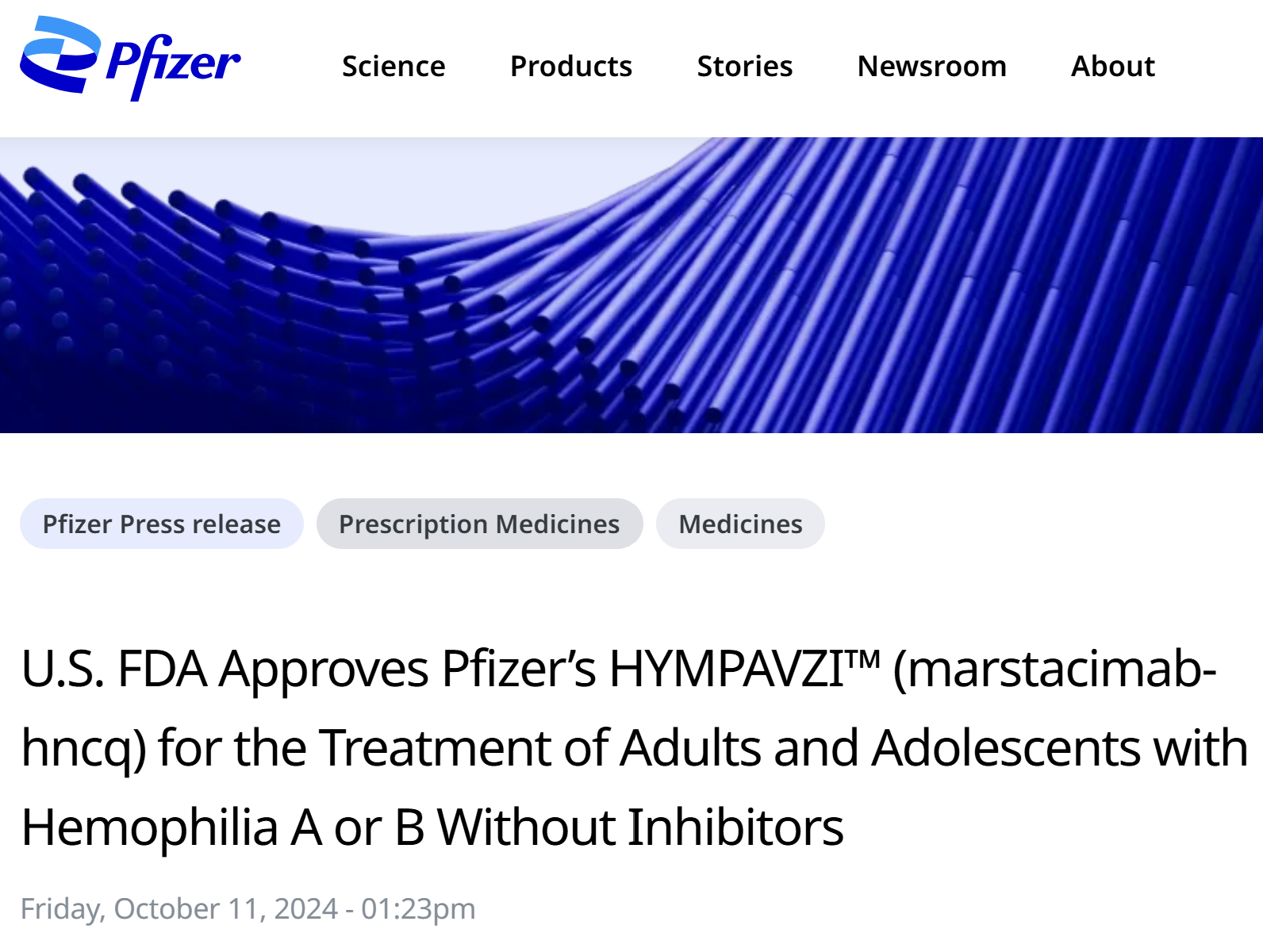 10月11日,FDA批准了辉瑞的血友病A或B药物 marstacimab,该药物将以 Hympavzi 品牌销售。该疗法是一种抗组织因子通路抑制剂,有助于血友病患者形成血栓,以限制其出血发作。