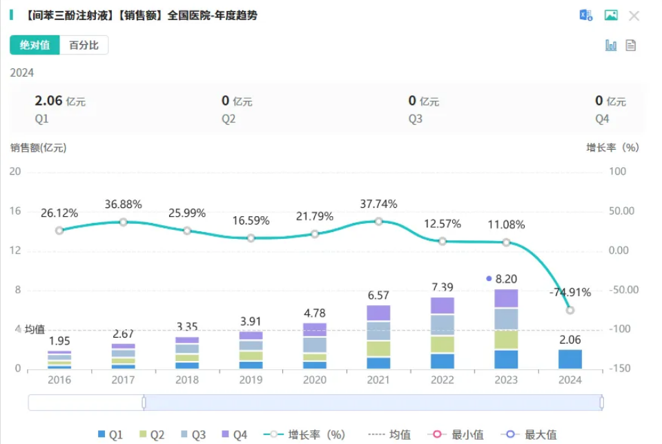 在流出的137个产品目录中,间苯三酚注射液是集采极度备受关注的品种。该品种是临床使用最普遍适应症最广泛的解痉药物,国内市场,间苯三酚注射液有30家药企获批,过评的有29家药企,本来市场不算大的品种,突然涌进来这么企业,市场竞争态势尤为激烈。据药融云数据库显示,该品种在2023年全国院内市场的销售额超8亿元,同比增长达11.08%。