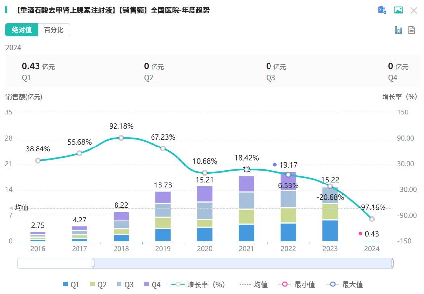 同时重酒石酸去甲肾上腺素注射液也是备受瞩目的品种之一。重酒石酸去甲肾上腺素注射液能收缩内脏静脉血管、增加内脏血管-下腔静脉压力差、促进血液回流到体循环、增加有效循环容量和回心血量等。据药融云数据库显示,该品种在2023年全国院内的销售额超15亿元。