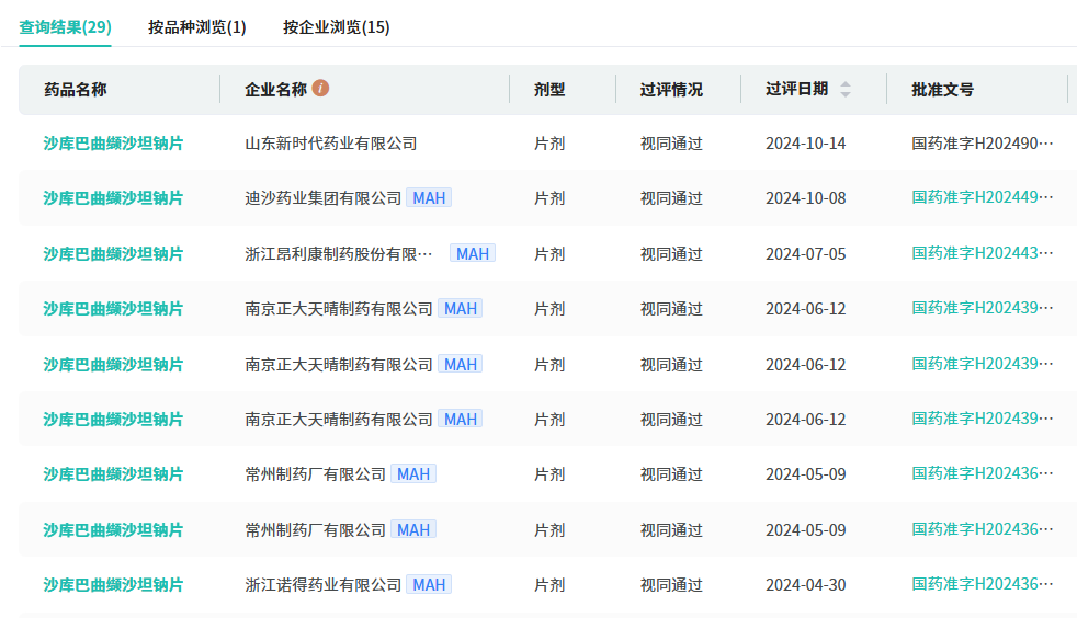 此前,国内已有14家本土企业的沙库巴曲缬沙坦钠片获批上市,包括正大天晴药业、石药集团欧意药业、四川科伦药业、齐鲁制药(海南)等。此次山东新时代药业的沙库巴曲缬沙坦钠片顺利获批上市,成为国产第15家。