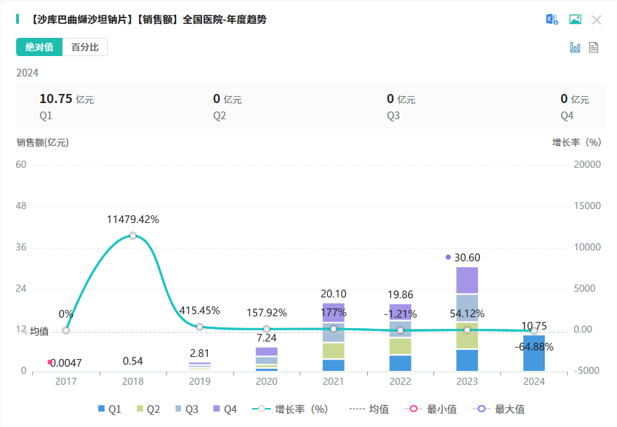 沙库巴曲缬沙坦钠片多年来,市场全部由诺华制药独占,据药融云数据库显示,2019年至2023年,诺华制药在国内院内市场已累计拿下80.62亿元的销售额。若第十批国家药品集中采购将沙库巴曲缬沙坦钠片纳入其中,这一稳固的市场格局预计将迅速且提前发生显著变化。