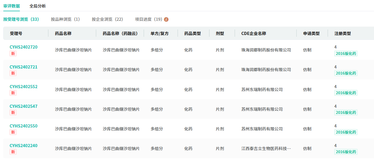 在仿制药布局方面,除山东新时代药业,目前沙库巴曲缬沙坦钠片有江苏万高药业、重庆圣华曦药业、华润双鹤药业等21家药企提交了4类仿制申请,均在审评审批中。