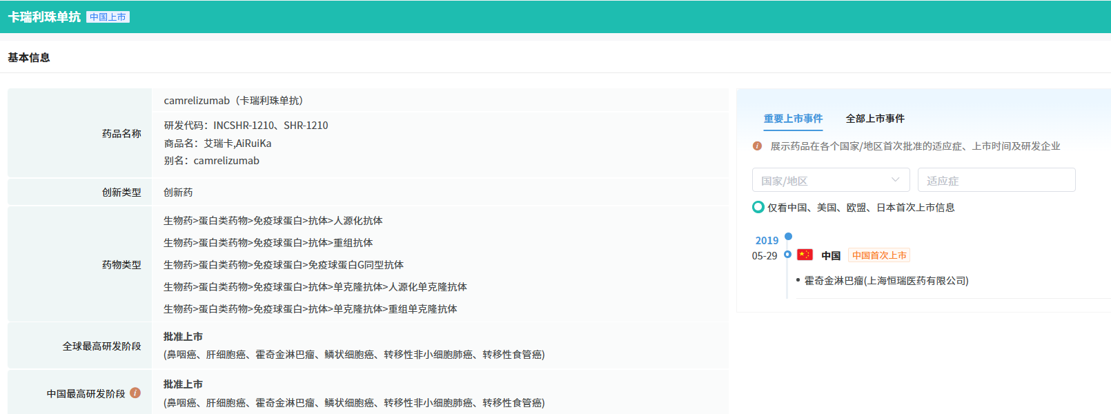 注射用卡瑞利珠单抗是人源化抗PD-1单克隆抗体。根据恒瑞医药公告,注射用卡瑞利珠单抗已在中国获批9个适应症,涵盖经典型霍奇金淋巴瘤、肝细胞癌、肺癌、食管鳞癌、鼻咽癌等。