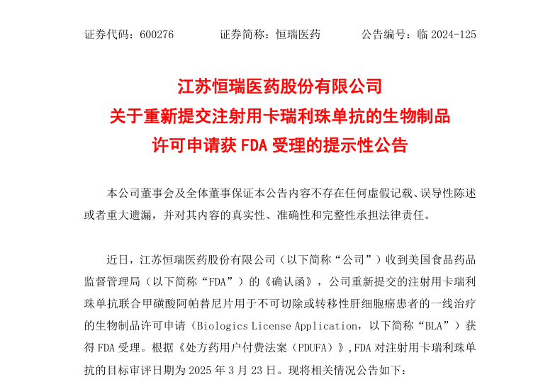 10月15日,据恒瑞医药发布公告称,公司重新提交的注射用卡瑞利珠单抗联合甲磺酸阿帕替尼片用于不可切除或转移性肝细胞癌患者的一线治疗的生物制品许可申请(BLA)获得美国FDA受理。FDA对注射用卡瑞利珠单抗的PDUFA日期为2025年3月23日。