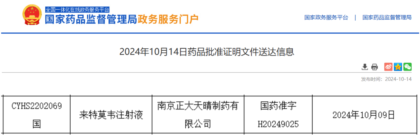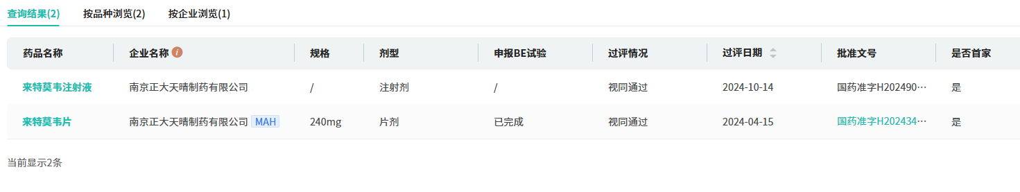 10月14日,据NMPA官网最新公示,正大天晴提交的来特莫韦注射液获批上市,成为该品种的首仿企业。据药融云数据库显示,今年4月,NMPA已批准了该公司来特莫韦片的上市申请。