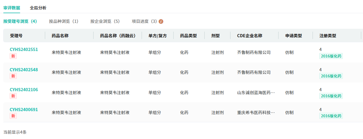 在仿制药布局方面,来特莫韦注射液国内有齐鲁制药、华北制药、山东诚创蓝海医药、重庆希韦医药、重庆博腾药业5家药企提交了4类仿制申请,均在审评审批中。