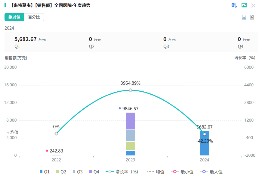 来特莫韦原研由默沙东研发,是一种新型巨细胞病毒末端酶抑制剂,通过抑制巨细胞病毒DNA末端酶复合物的活性来阻止病毒DNA的加工和包装,从而发挥抗病毒的作用。2022年,原研来特莫韦片剂及注射液先后在国内获批。2023年,来特莫韦片和来特莫韦注射液通过国谈被纳入国家医保乙类药物目录。据药融云数据库显示,2023年,来特莫韦在全球的销售额为6.05亿美元,同比增长达41.36%。此外,在2023年全国院内市场,来特莫韦(片剂+注射剂)的销售总额超9千万。