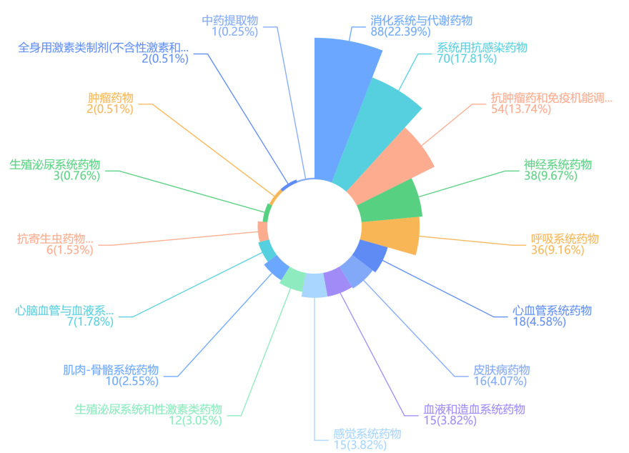 本次华东医药司美格鲁肽注射液体重管理适应症临床试验申请获批,是该款产品研发进程中的又一重要里程碑。华东医药以 GLP-1 靶点为研究核心,涵盖口服、注射剂等多种剂型,包括长效、单靶点和多靶点全球创新药和生物类似药相结合的6款在研及已上市产品管线。中美华东相关产品治疗领域中消化与代谢系统药品占比最高,占22.39%,所有产品治疗领域分布如下: