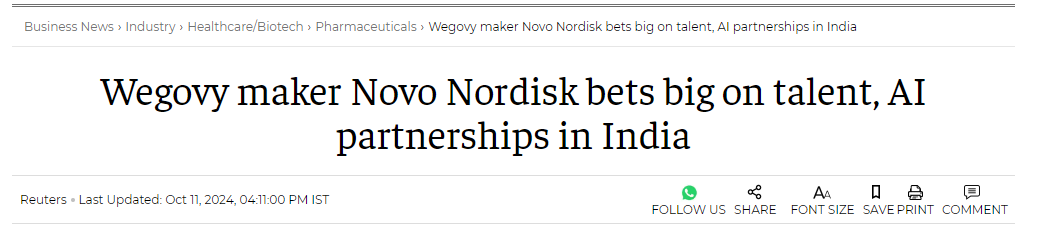 参考资料:https://economictimes.indiatimes.com/industry/healthcare/biotech/pharmaceuticals/wegovy-maker-novo-nordisk-bets-big-on-talent-ai-partnerships-in-india/articleshow/114148019.cms