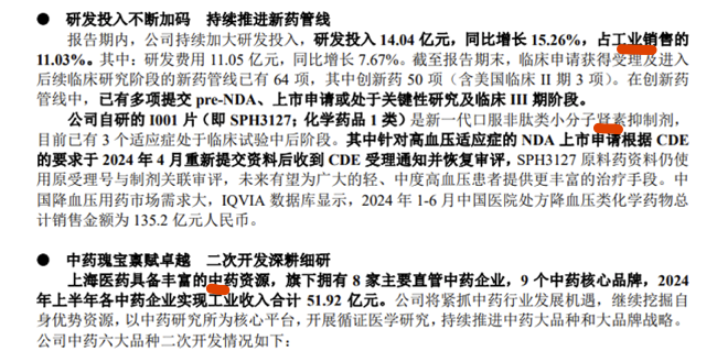 2024财年上半年,公司研发投入不菲,达14.04亿元。2024年中报显示,上海医药营收1394.1亿元,同比增长5.1%;扣非净利润27.1亿元,同比增长23%。