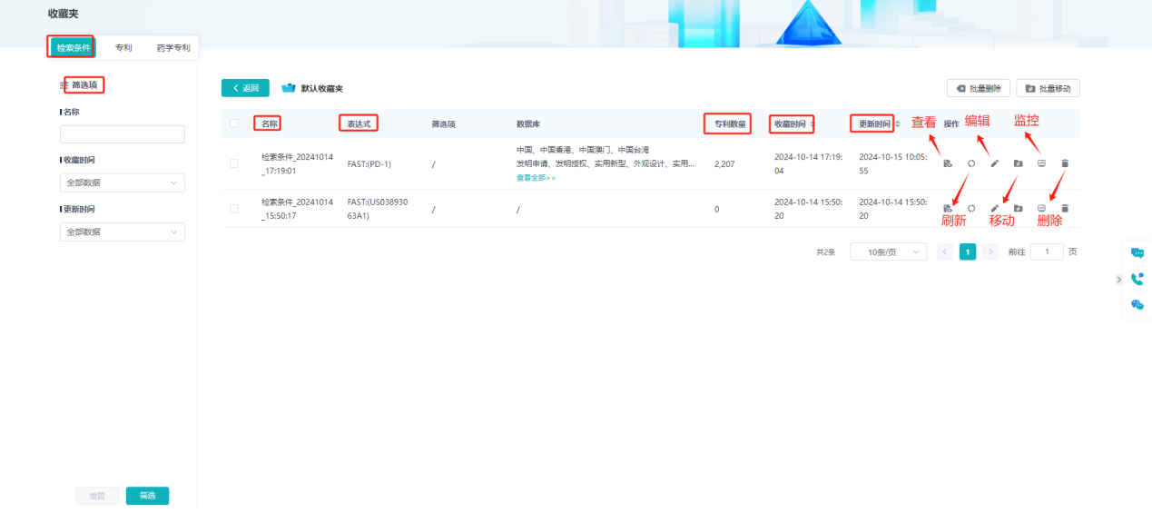 收藏功能板块,包含检索条件与具体专利的收藏。用户可便捷地将检索条件存入收藏文件夹,文件夹直观展示表达式、专利数、收藏及更新时间,并支持按文件夹名称、收藏或更新时间二次筛选,且能对收藏项执行查看、更新、编辑、移动、监控及删除操作。