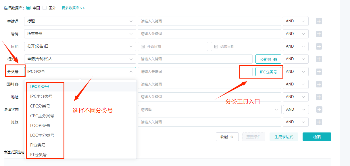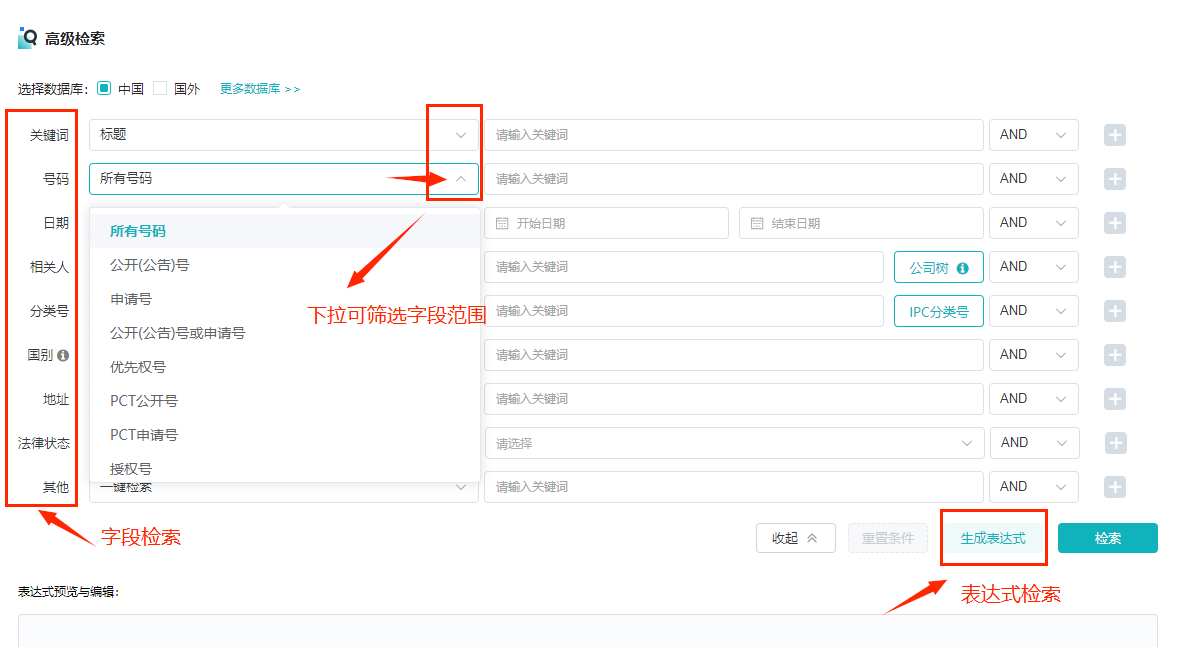 高级检索功能,包含字段检索与表达式检索。字段检索,支持根据关键词、号码、日期、相关人、分类号、国别、地址、法律状态及其他9种类型的字段,进行灵活多样的组合式检索,提升检索的精确度和效率。